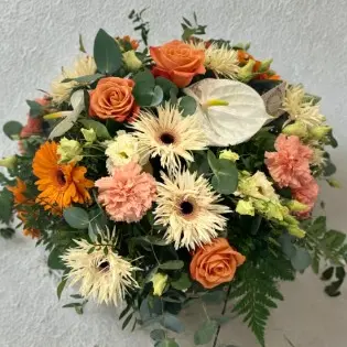 Un coussin chaleureux aux nuances d’orange et de beige, évoquant réconfort et sérénité pour un dernier hommage lumineux.