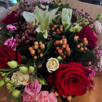 Un bouquet vibrant de rouge, blanc et rose, exprimant tendresse, passion et affection pour célébrer un hommage plein de vie et de couleurs.